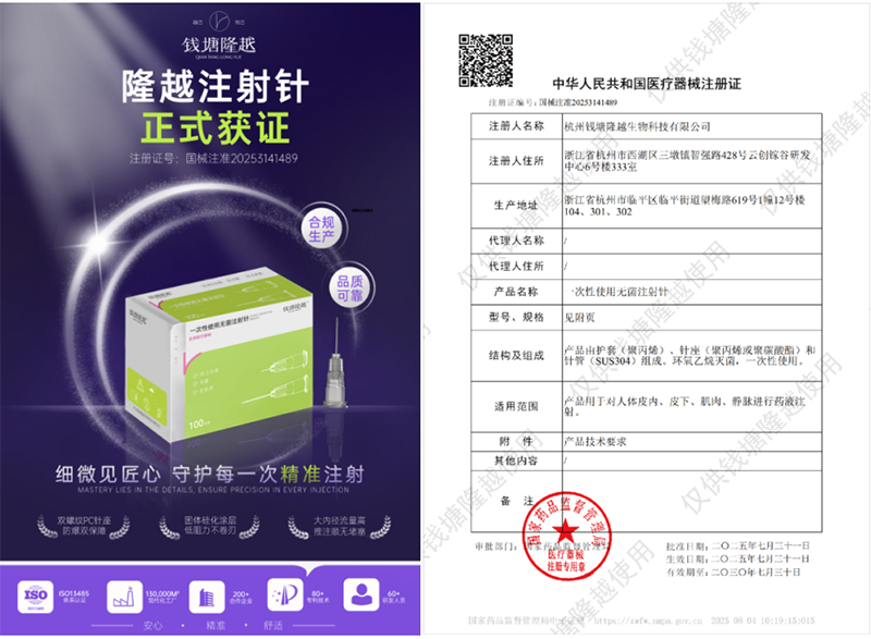 2025年07月31日,杭州钱塘隆越生物科技有限公司自研的「一次性使用无菌注射针」正式获得国家药品监督管理局发的三类医疗器械注册证,注册证编号:国械注准20253141489。